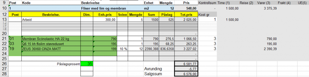 Vareid fylles inn i kolonnen “Kode”. Verdiene i kolonnene “Beskrivelse”, “Enhet” og “Pris” hentes fra arket “Varer” med følgende formel.