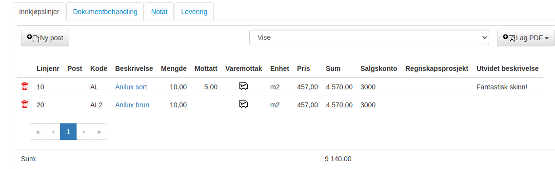 Benytt Varemottak.png på den enkelte linjen for å se Bestilling og oppdatere antall mottatt.