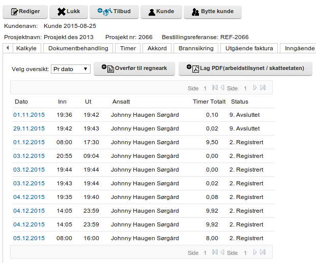 Antall timer blir summert på prosjekt. Det vil med disse registreringene også være mulig å få med antall timer utført av personell med fast lønn / akkord.