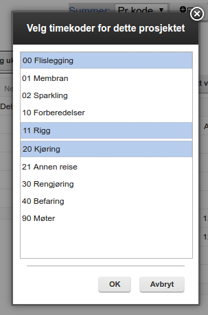 Koder finnes igjen under fanen Timer på prosjekt. Der er en oversikt og en oppsummering.