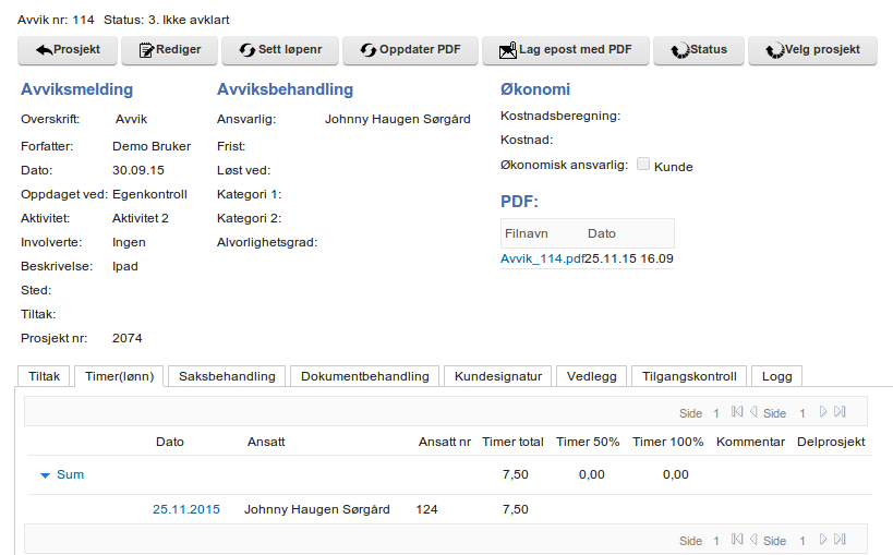 Når denne er merket av er det mulig å knytte timeregistrering til avvik. Dette er ren informasjon.